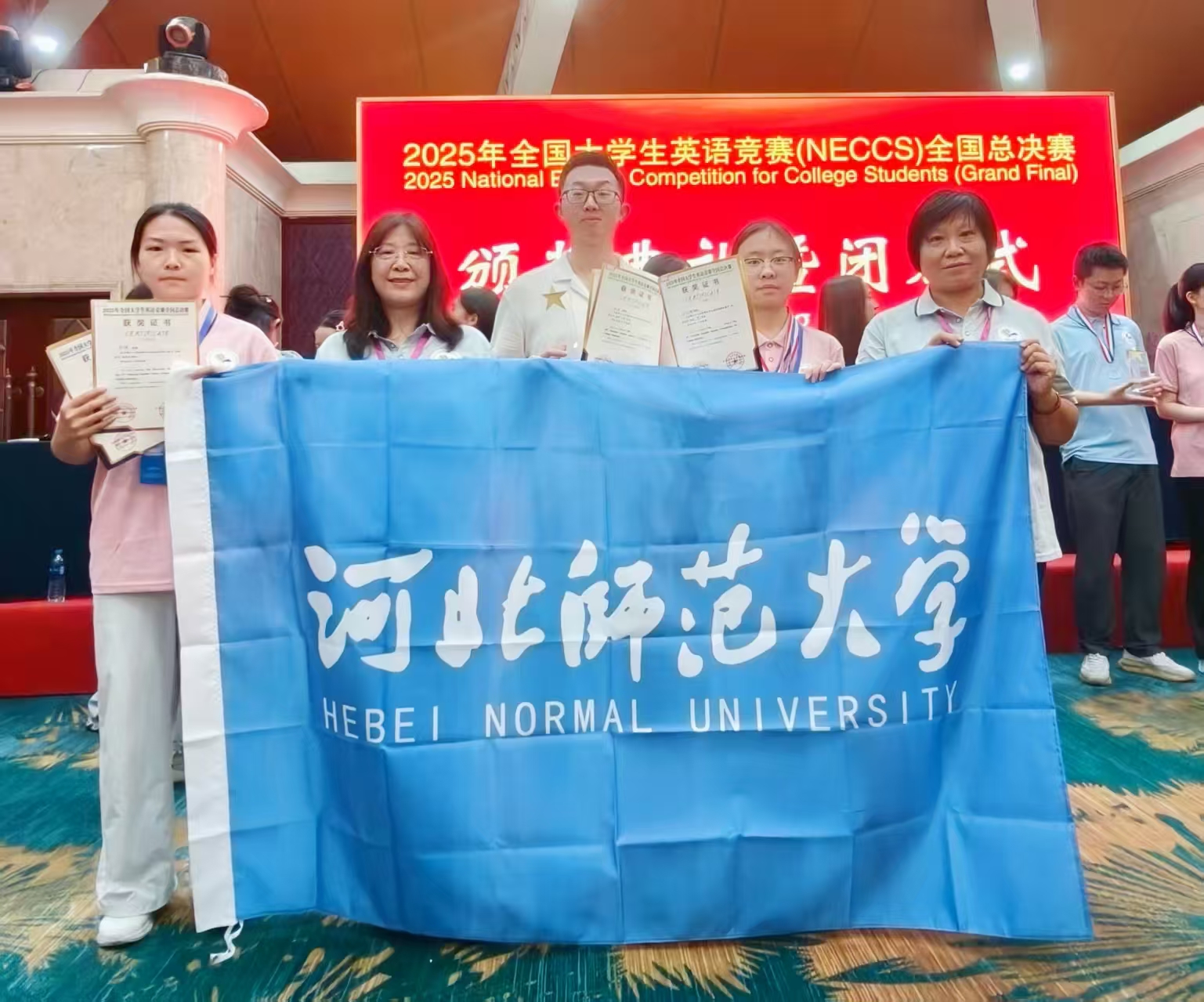8月2日至7日,2025年全国大学生英语竞赛(NECCS)全国总决赛在郑州举办,我校选手取得历史最佳成绩。张源、王烁熠、程璇分别荣获总决赛英语演讲比赛一等奖、二等奖及优秀奖,王烁熠荣获总决赛英语辩论赛三等奖,张源、王烁熠、程璇荣获总决赛英语风采大赛优秀奖。